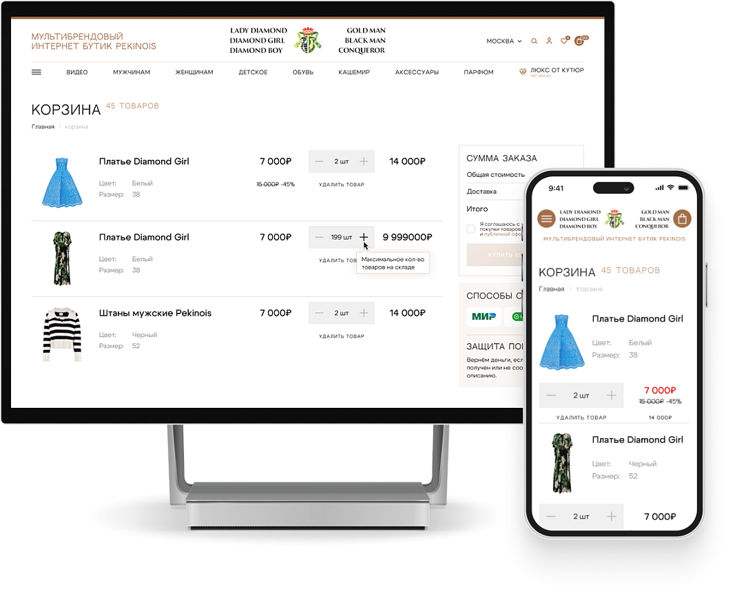 • Удобная корзина с возможностью перехода между «готовыми к покупке» и «нет в наличии» товарами.
